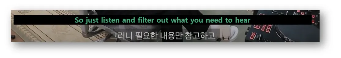 아래는 Color를 녹색, 배경창 불투명도를 100% 로 설정했을 때 자막입니다.