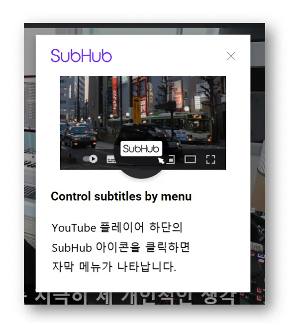 SubHub 유튜브 자막 뷰어 (크롬 확장프로그램)를 설치하고 YouTube 에서 처음 콘텐츠를 재생하면 아래와 같은 팝업을 볼 수 있습니다.