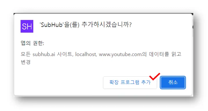 아래 팝업에서 확장 프로그램 추가 버튼을 선택해주세요.