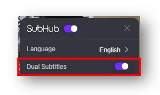 Dual Subtitles 를 On 하면 원문(출발어)과 선택한 번역자막(도착어)를 동시에 볼 수 있습니다.